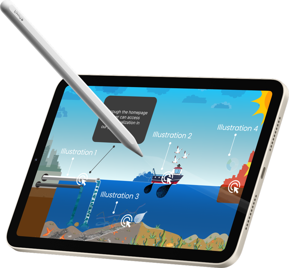 Four different interactive visualisations showing issues related to life under water caused by humans.
